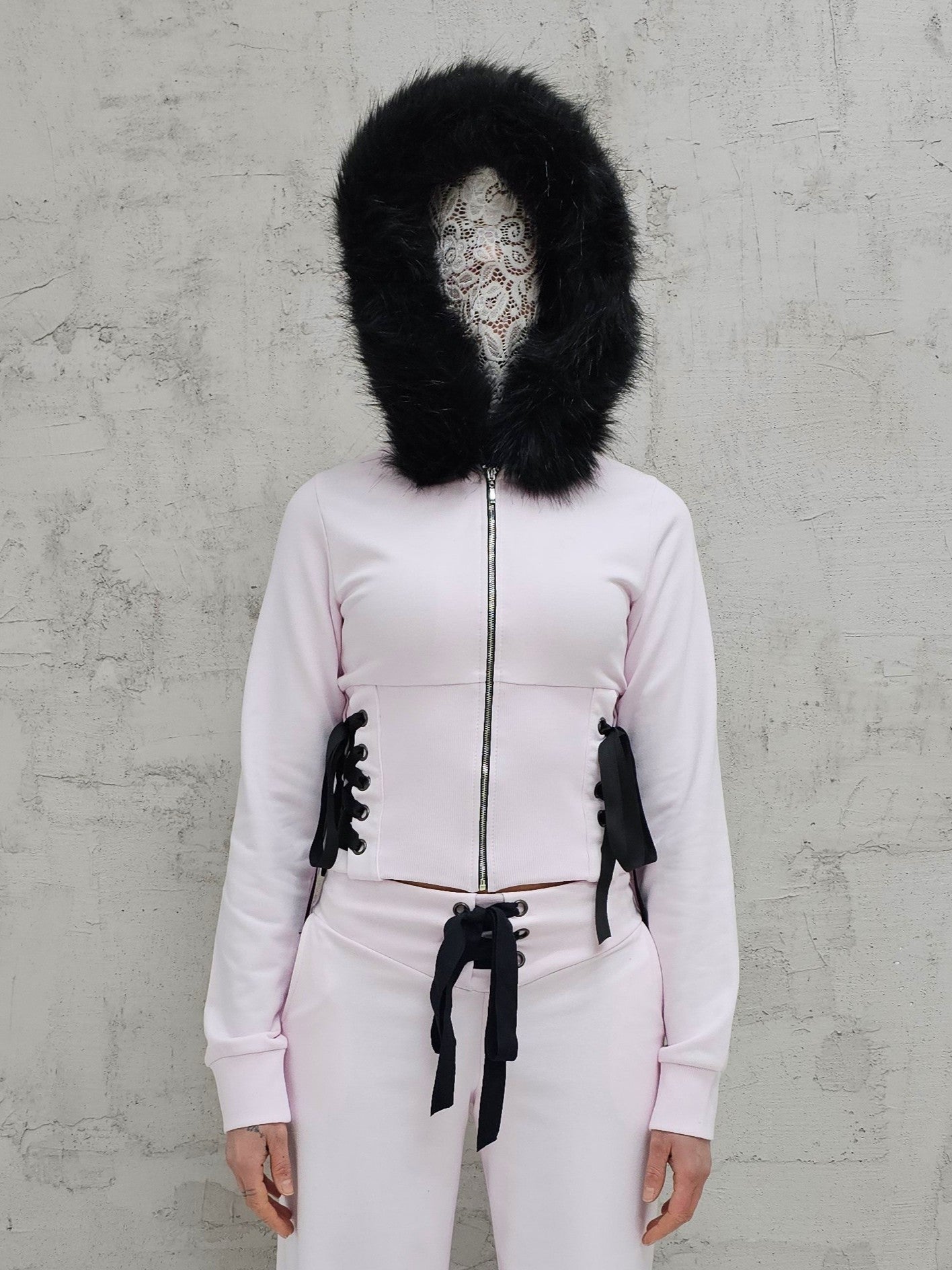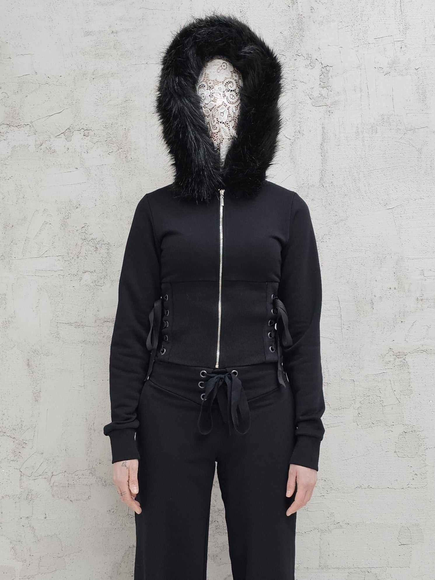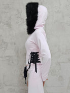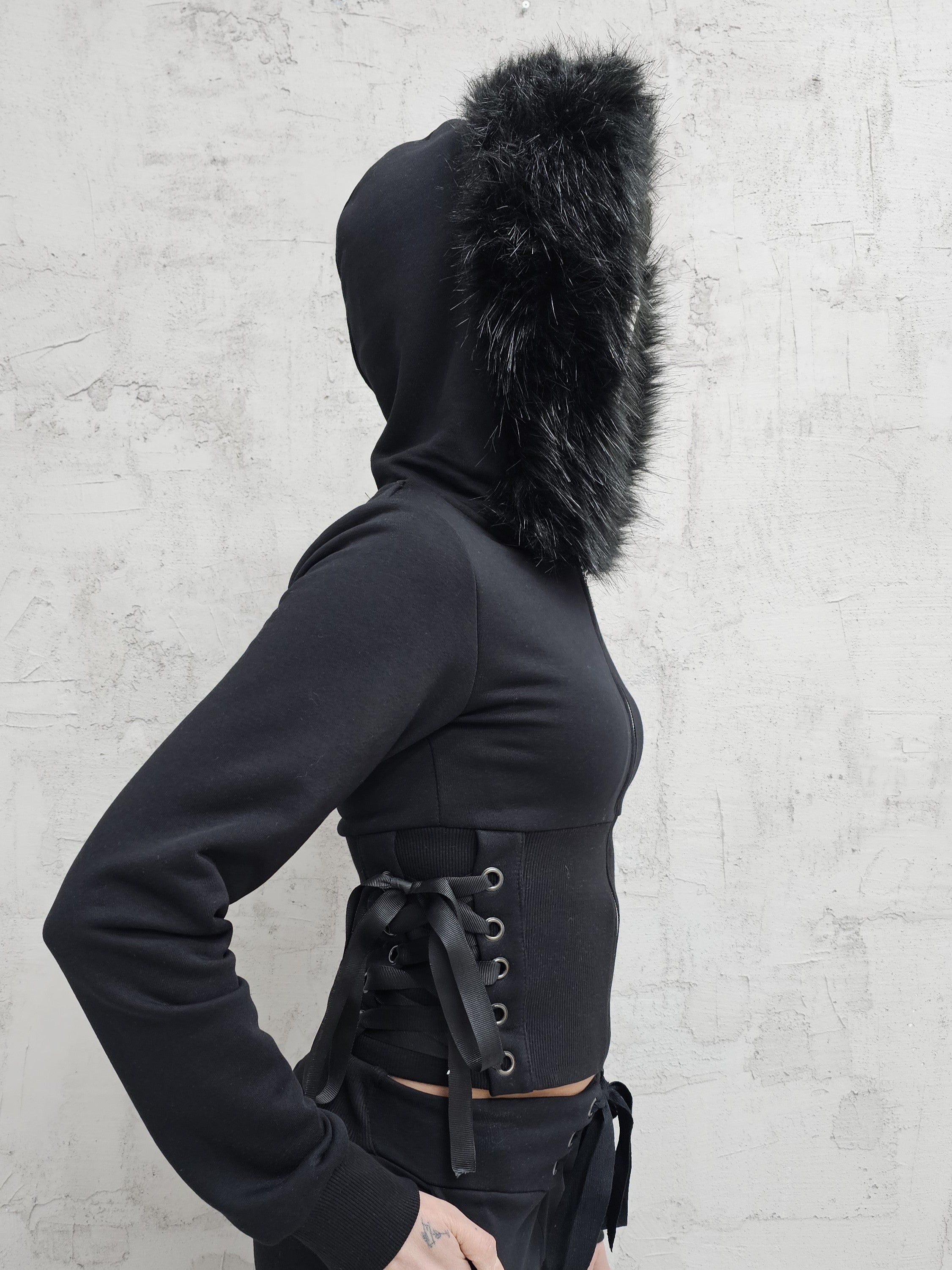 - OPIS PRODUKTU- Unikalna bluza T4SHA z dropu Lolita. Dopasowana bluza z futrem w kapturze , szerokim ściągaczem w talii i wiązaniem gorsetowym na bokach. Bluza o fasonie cropped. Bluza rozpinana na stalowy zamek.